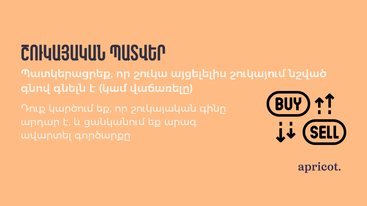 Նախորդ մասում սկսել ենք խոսել այն մասին, թե ինչպես գնել «սերմեր» ձեր ֆինանսական այգու համար և ներկայացրել Լիմիտային պատվերները, որոնք ձեզ սեփական գինը սահմանելու ճկունություն են տալիս: Այսօր կքննարկենք պարզ, բայց կարևոր պատվերի տեսակ՝ շուկայական պատվերը: