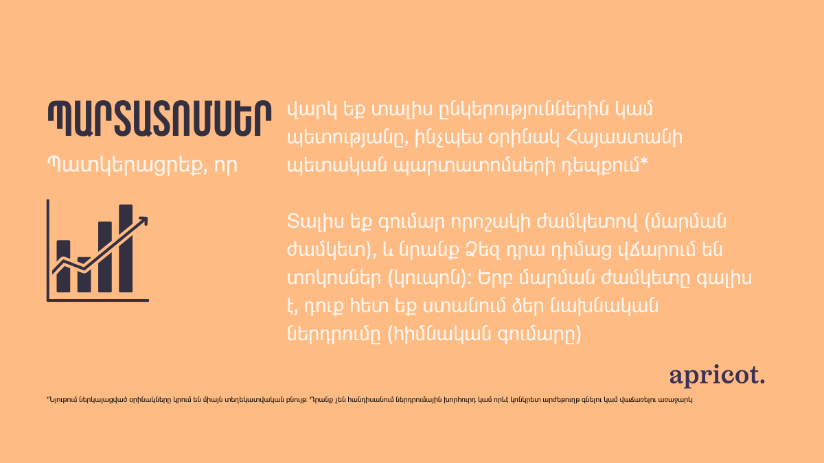 — Պատկերացրեք, որ վարկ եք տալիս ընկերություններին կամ պետությանը, ինչպես օրինակ Հայաստանի պետական պարտատոմսերի դեպքում*: Տալիս եք գումար որոշակի ժամկետով (մարման ժամկետ), և նրանք Ձեզ դրա դիմաց վճարում են տոկոսներ (կուպոն): Երբ մարման ժամկետը գալիս է, դուք հետ եք ստանում ձեր նախնական ներդրումը (հիմնական գումարը):