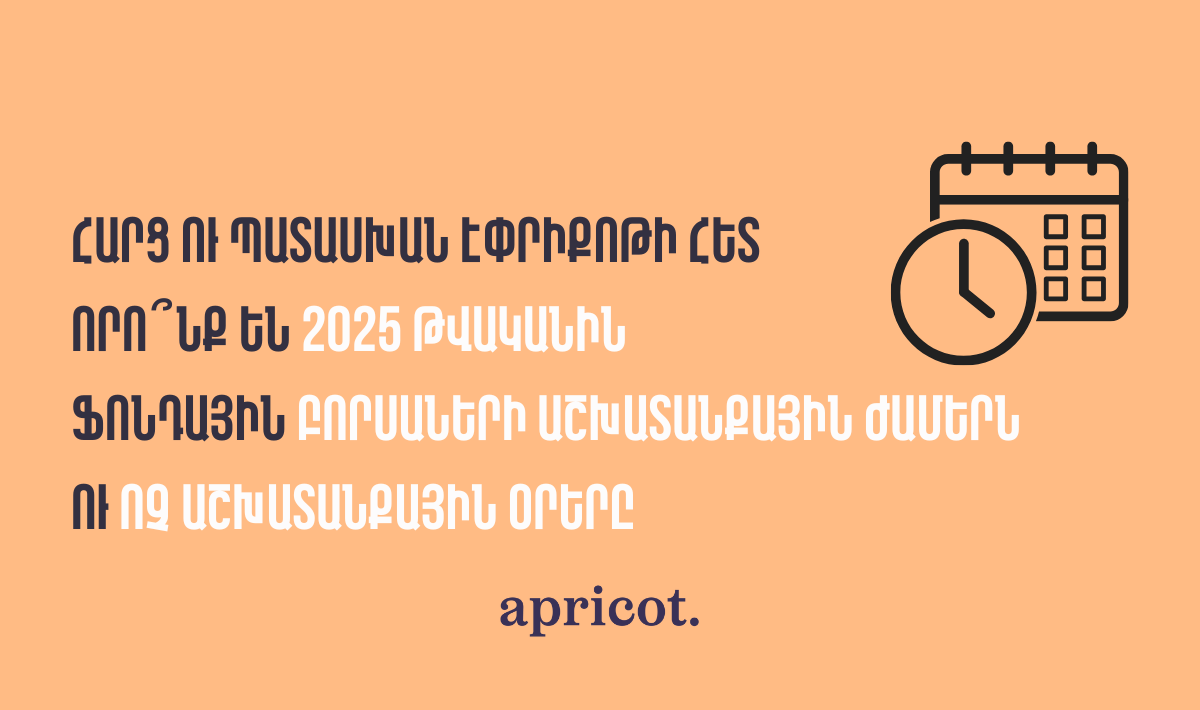 Այս հոդվածում ներկայացնում ենք 2025 թվականի համար Apricot Capital-ի հավելվածի միջոցով հասանելի ֆոնդային բորսաների աշխատանքային ժամերը և ոչ աշխատանքային օրերը։