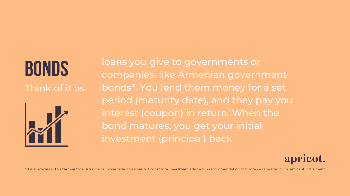 – Think of it as loans you give to governments or companies, like Armenian government bonds*. You lend them money for a set period (maturity date), and they pay you interest (coupon) in return. When the bond matures, you get your initial investment (principal) back.